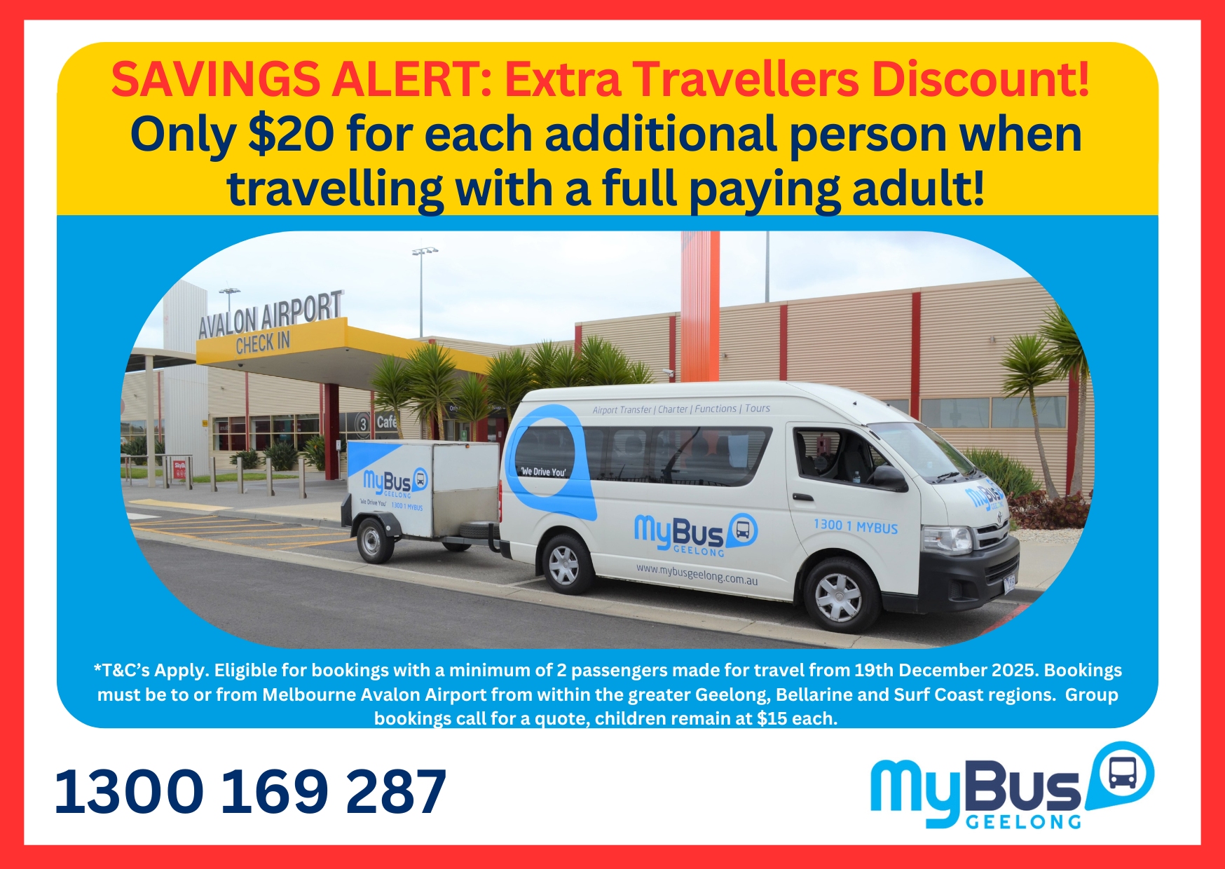 To book your seat on the MyBus Avalon Airport Transfer please call 1300 169 287 that’s 1300 1 MYBUS or email hello@mybusgeelong.com.au during business booking hours. Please confirm in your email that you are requesting an Avalon Airport transfer, with your date and drop off or pick up location.